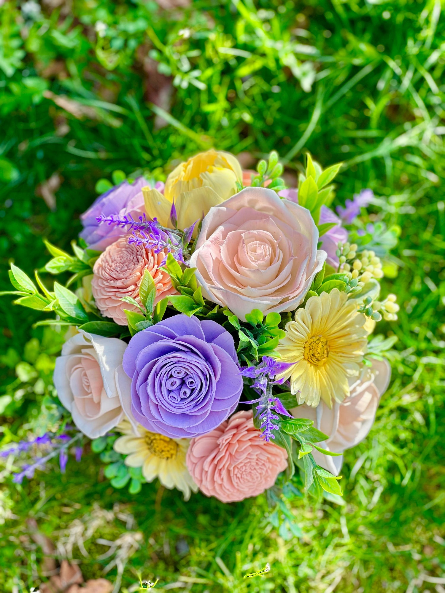 Sola Wood Flowers are not fresh flowers. They are made from the root of a sustainable plant called aeschynomene aspera, more commonly known as 'sola.' These flowers are handcrafted, painted, and arranged into beautiful designs that will never wilt or die. View our FAQ to learn more.