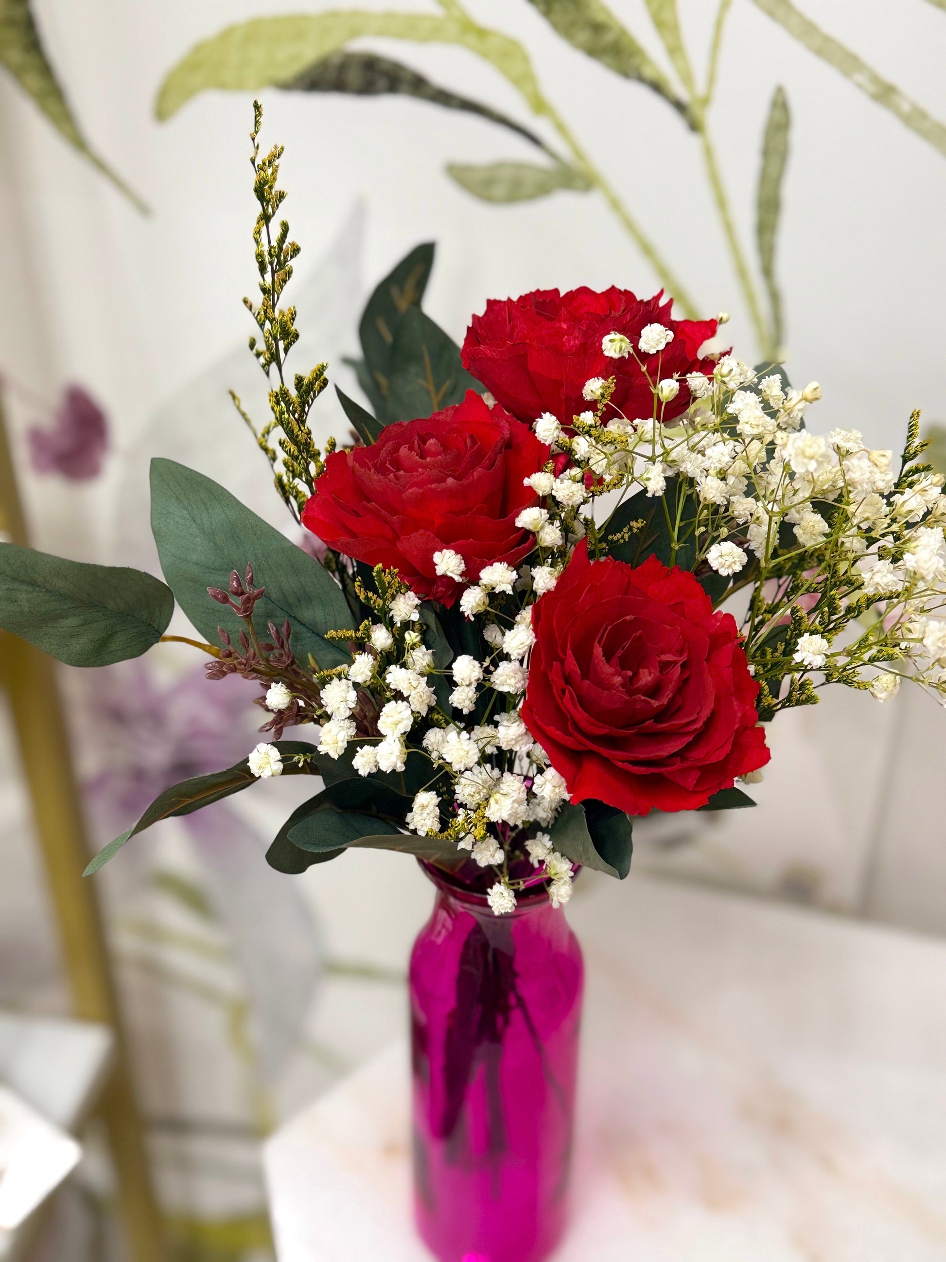 A classic Valentine’s gesture with a lasting twist. This bud vase bouquet features three roses accented with delicate baby’s breath, thoughtfully designed for a romantic, effortless look. Available in red or pink, each arrangement is styled in a bud vase (vase color may vary based on availability), making every piece one of a kind. Perfect for Valentine’s Day gifting or adding a touch of love to any space.
